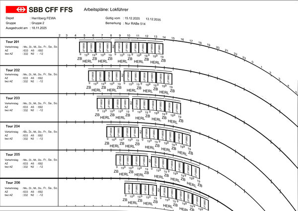 Unsere Einteilung zeigt schon jetzt, was auf uns zukommt: Von fünf Arbeitstagen sind wir im Schnitt drei- bis viermal auf derselben Strecke – S(1)5 oder S6, Tag für Tag dieselben Abschnitte, dieselben Abläufe, dieselbe Eintönigkeit. Abwechslung? Fehlanzeige. Lokführende der Traversogruppe können mit uns LfAs schon ein Lied singen. Das ist kein verantwortungsvoller Beruf mehr, das grenzt schon fast an stupides Durchrödeln im Minutentakt.