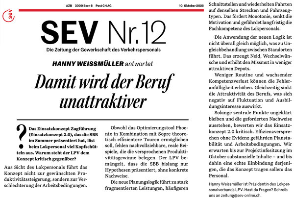 Der Beruf Lokführer:in ist eine verantwortungsvolle und interessante Tätigkeit. Zudem nehme ich die SBB als sehr attraktive Arbeitgeberin war. Mir ist auch bewusst, dass unser Unternehmen für eine erfolgreiche Zukunft wirtschaftlich effizient aufgestellt sein muss und dadurch zwangsläufig gewisse Optimierungen notwendig sind. Auch bei unseren Touren können auf eine vernünftige Art und Weise Anpassungen vorgenommen werden, welche für alle Beteiligten verträglich sind. Was nun aber mit dem Einsatzkonzept ZFR 2.0 erzielt werden soll, kann ich nicht nachvollziehen und sehe am Ende nur Verlierer: